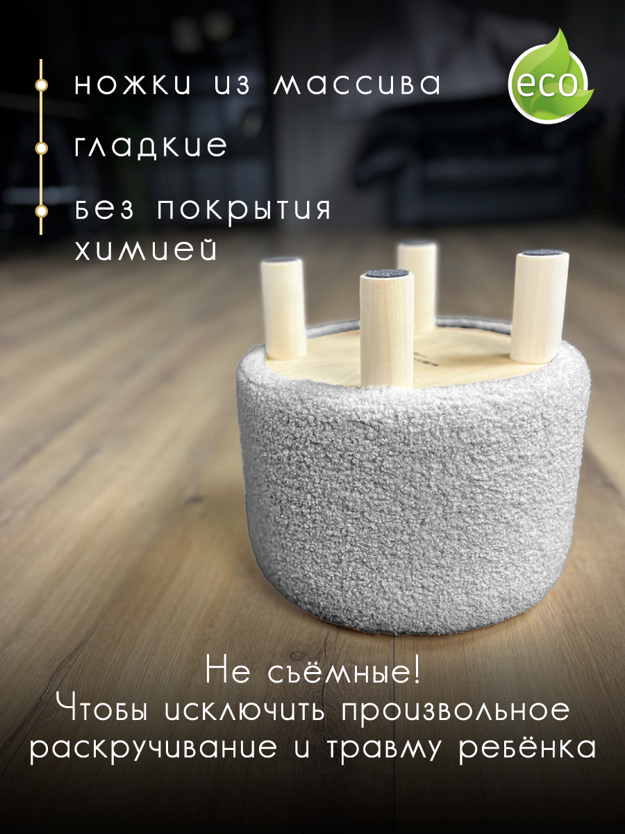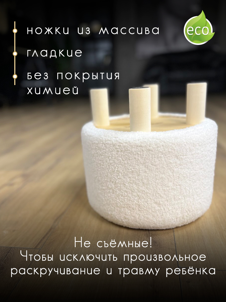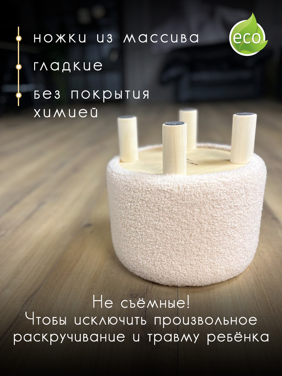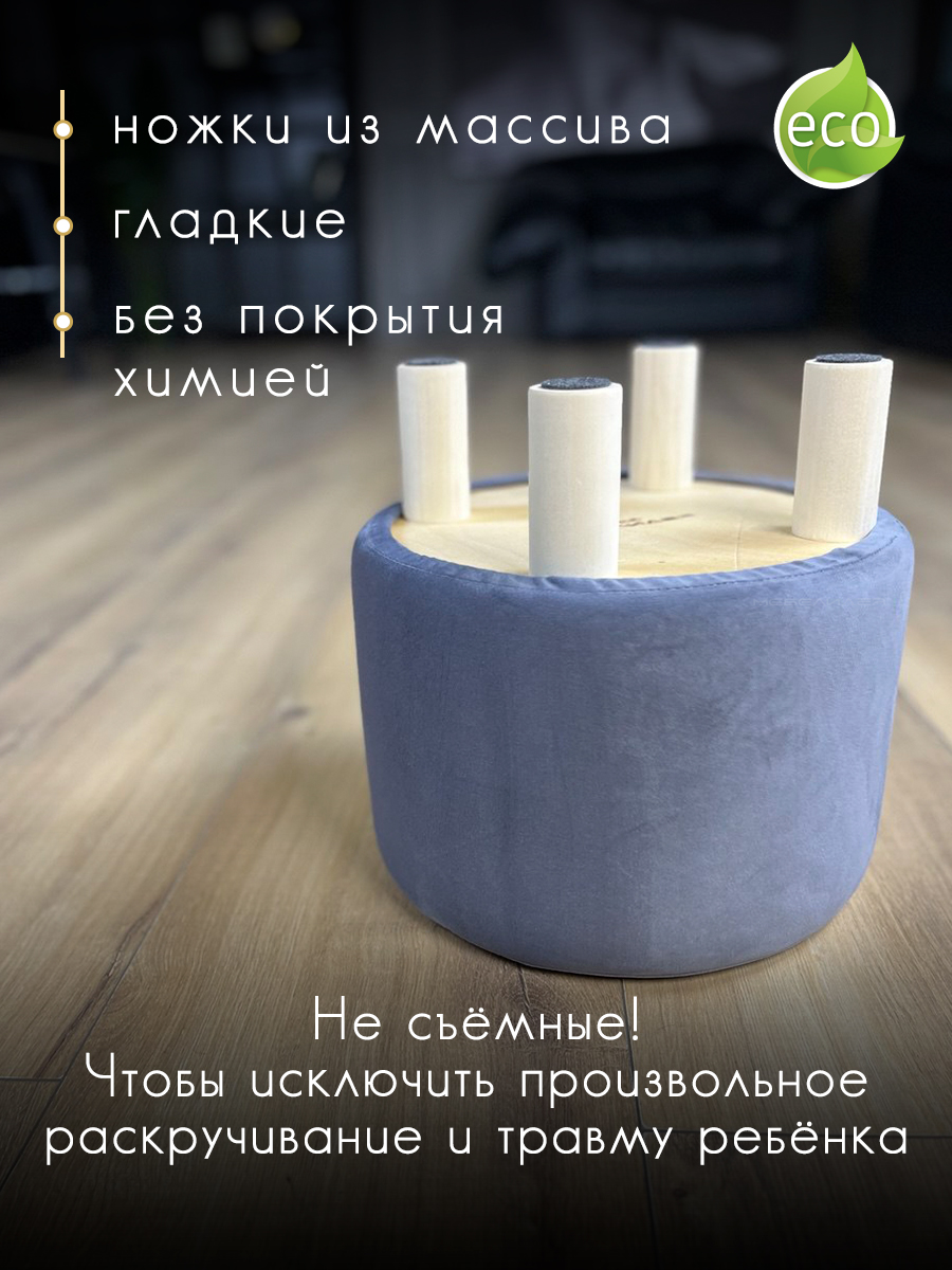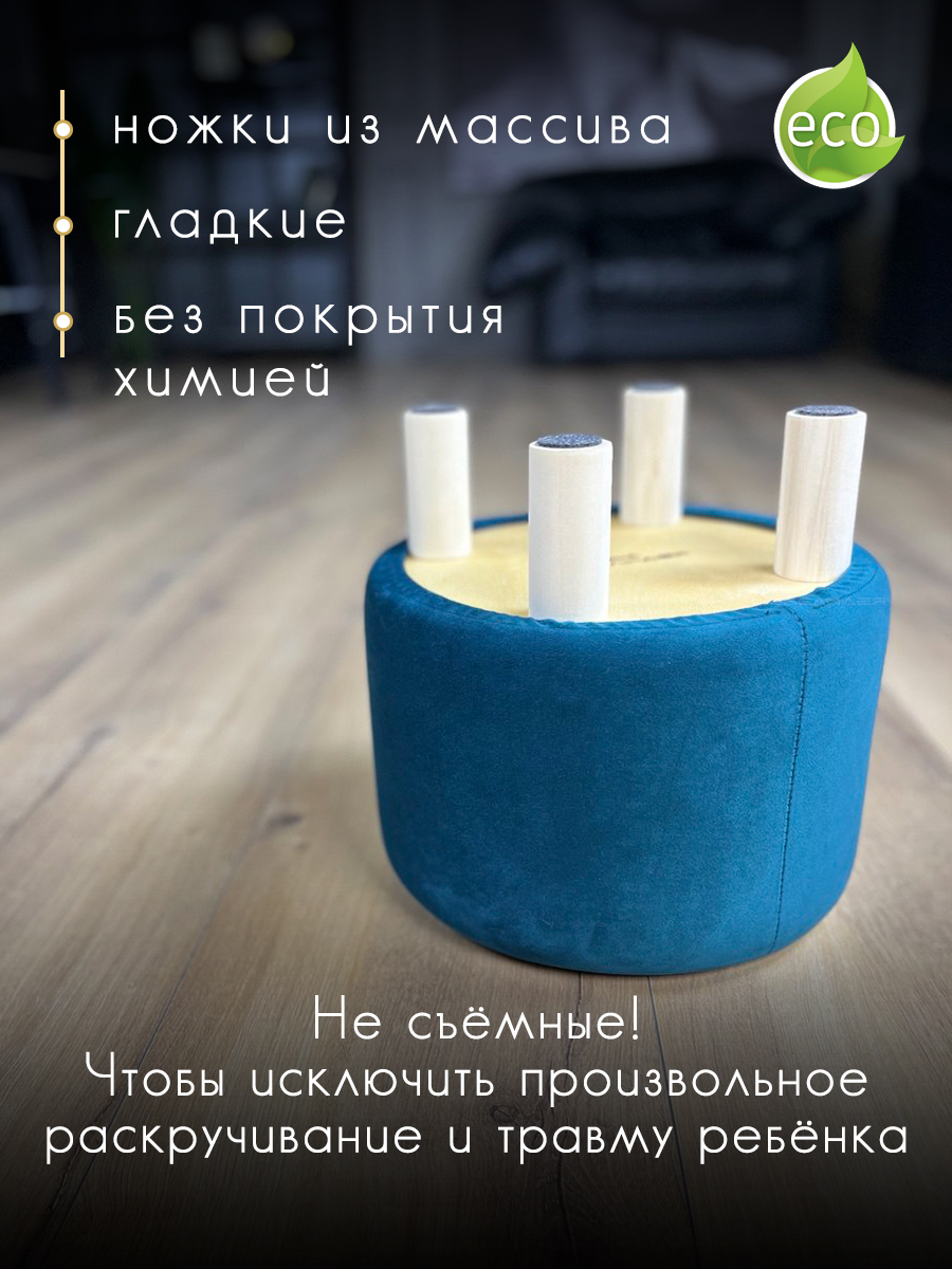 Детский пуф очень лёгкий, вес всего 1,5 кг. Двухлетний малыш без труда поднимает и несёт его по комнате. Каркас пуфа изготовлен из фанеры, поэтому наш маленький стульчик не только легкий и крепкий, но и экологичный, что особенно важно в детской мебели. Высота банкетки 27 см, диаметр 28 см, высота ножек 8 см. Ножки изготовлены из натурального дерева, гладкие и ровные, фетровые подпятники для защиты вашего пола уже установлены. Для наибольшей безопасности ребёнка ножки не снимаются, они основательно крепятся ещё в каркасе, поэтому произвольное раскручивание и поломка исключены на 100%. Верхнее покрытие пуфа поролоновое, толщиной 2 см, боковой поролон толщиной в 1 см. Резинка-фиксатор уже вшита и отрегулирована на нужное натяжение.