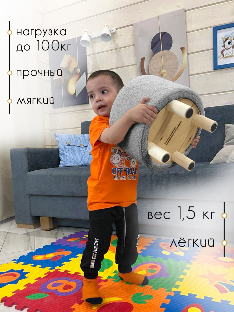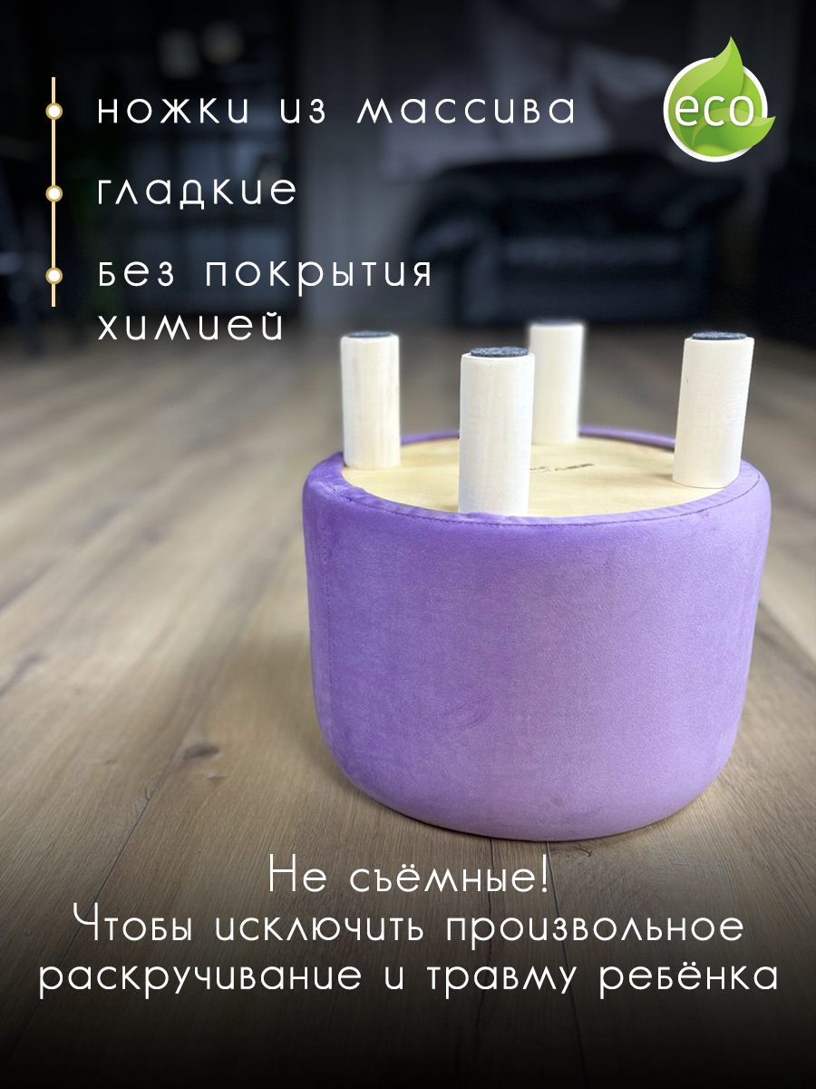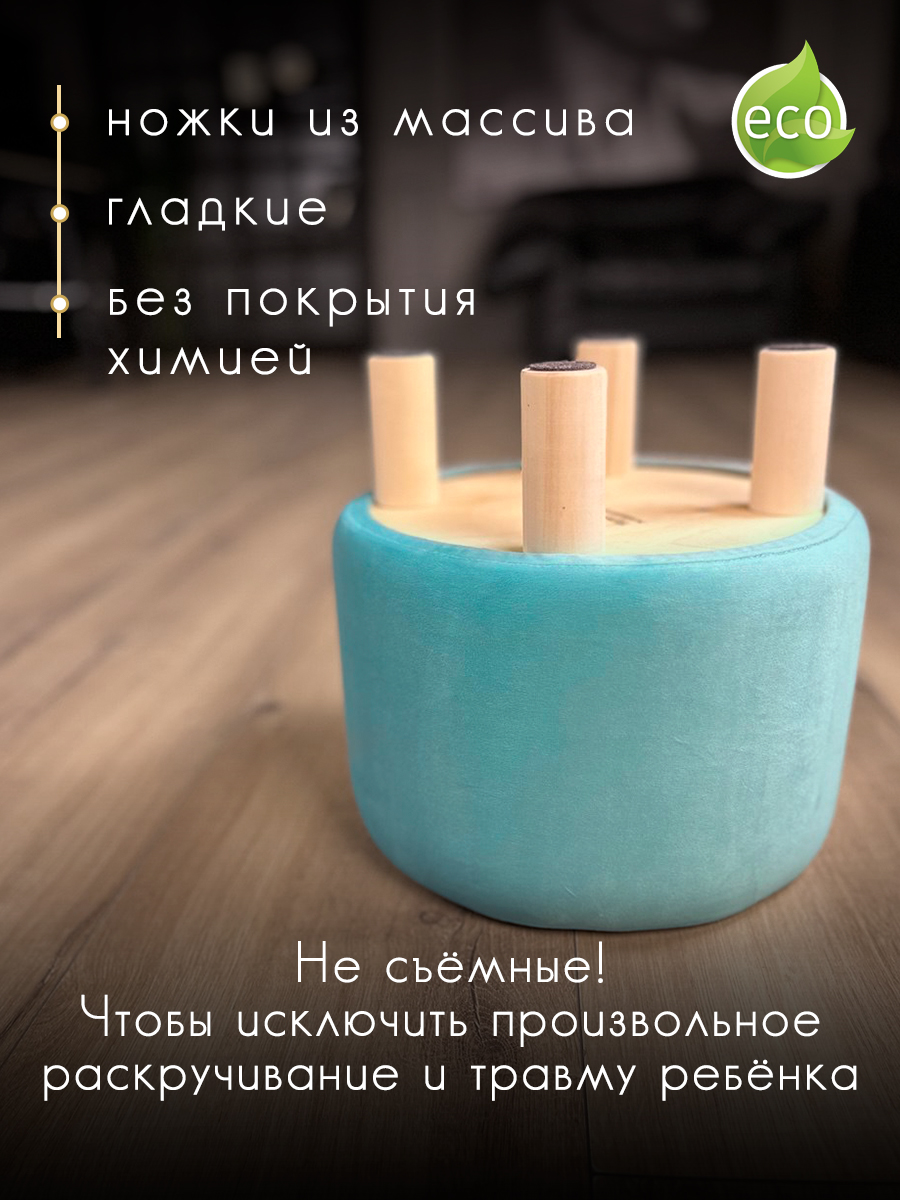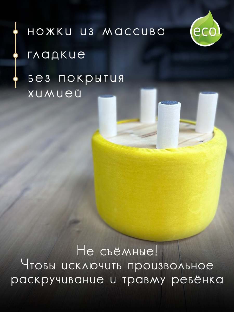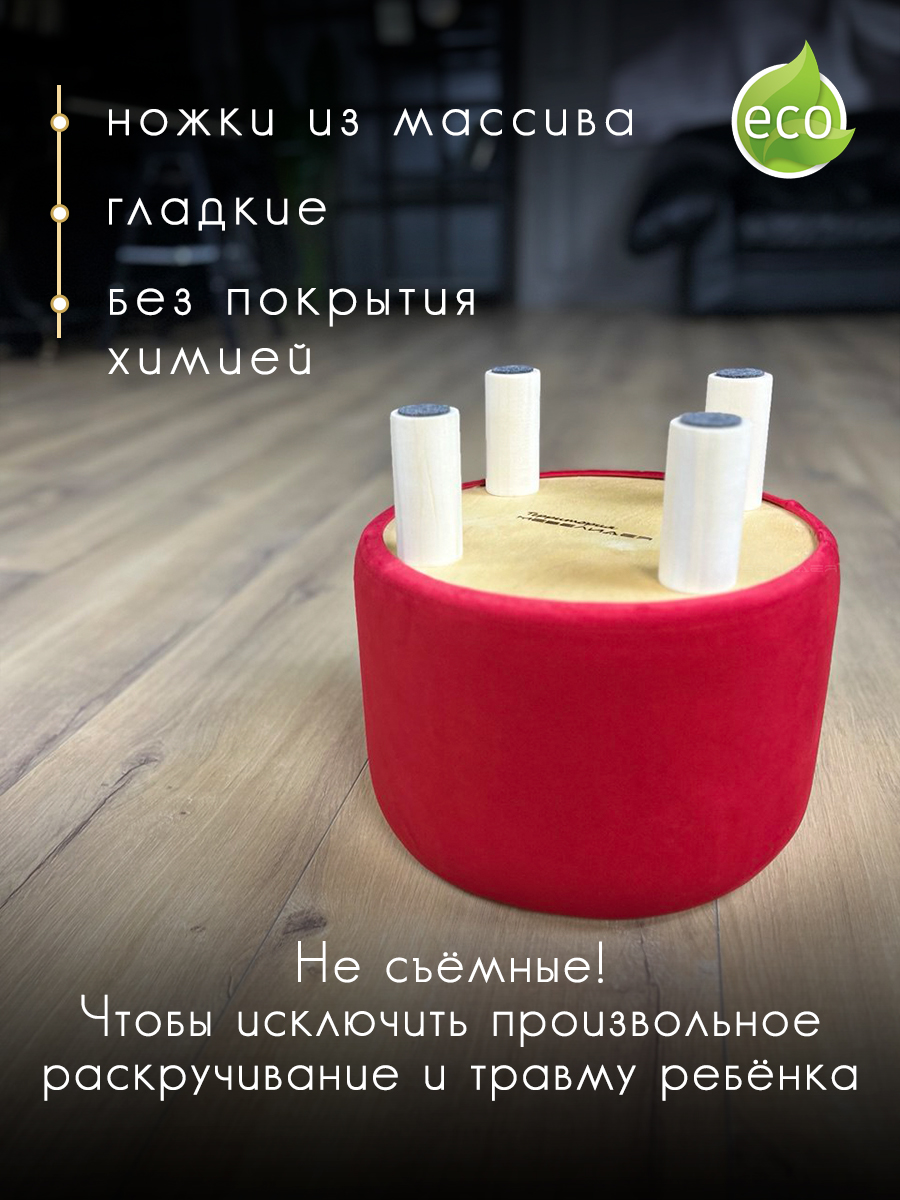 Детский пуф очень лёгкий, вес всего 1,5 кг. Двухлетний малыш без труда поднимает и несёт его по комнате. Каркас пуфа изготовлен из фанеры, поэтому наш маленький стульчик не только легкий и крепкий, но и экологичный, что особенно важно в детской мебели. Высота банкетки 27 см, диаметр 28 см, высота ножек 8 см. Ножки изготовлены из натурального дерева, гладкие и ровные, фетровые подпятники для защиты вашего пола уже установлены. Для наибольшей безопасности ребёнка ножки не снимаются, они основательно крепятся ещё в каркасе, поэтому произвольное раскручивание и поломка исключены на 100%. Верхнее покрытие пуфа поролоновое, толщиной 2 см, боковой поролон толщиной в 1 см. Резинка-фиксатор уже вшита и отрегулирована на нужное натяжение.