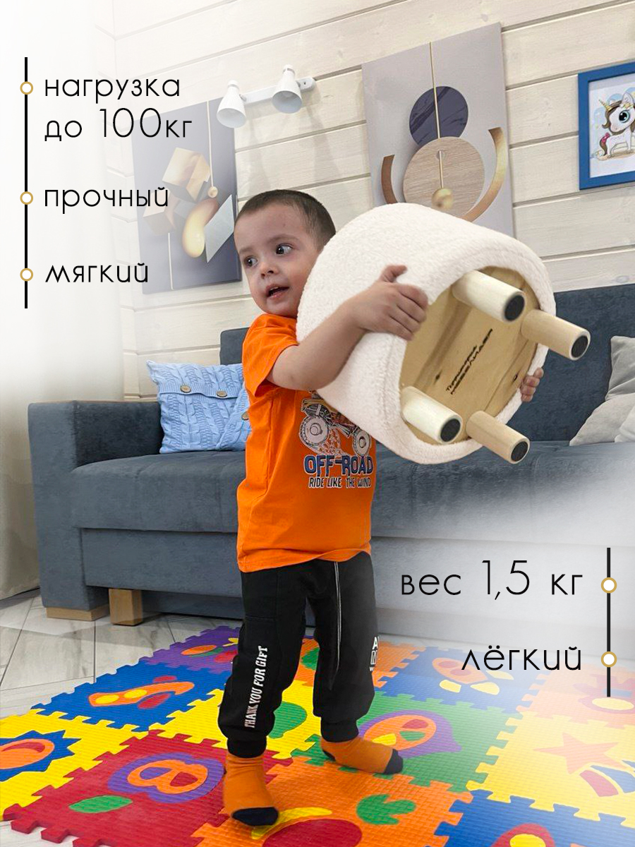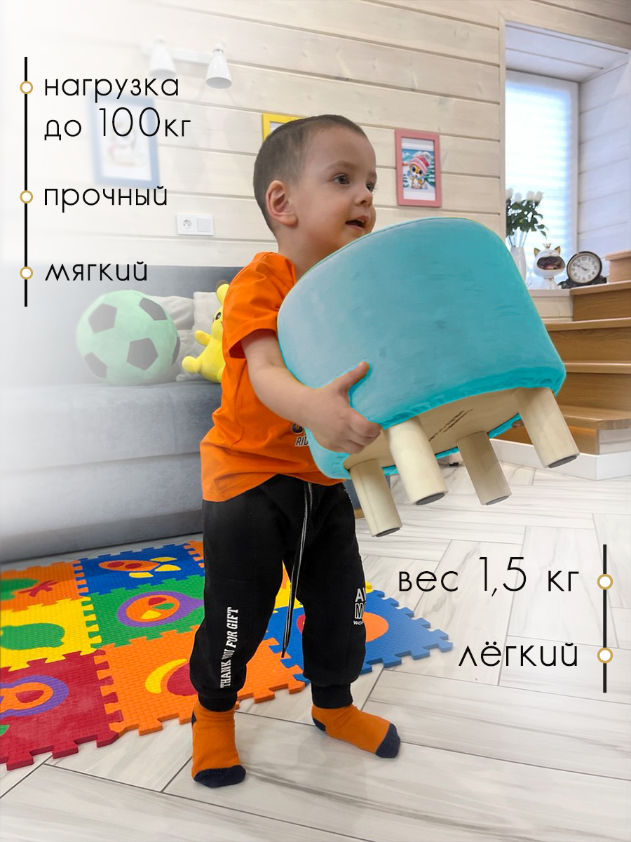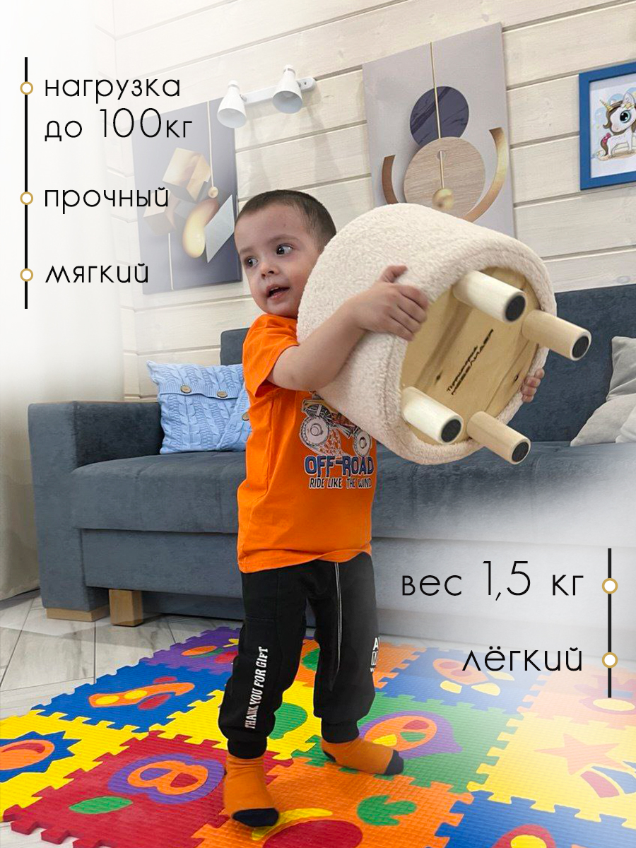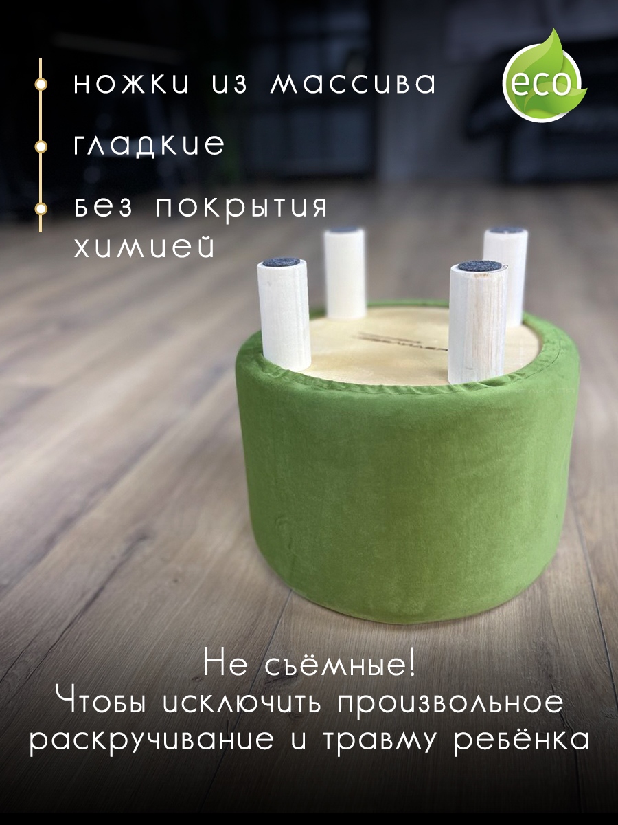 Детский пуф очень лёгкий, вес всего 1,5 кг. Двухлетний малыш без труда поднимает и несёт его по комнате. Каркас пуфа изготовлен из фанеры, поэтому наш маленький стульчик не только легкий и крепкий, но и экологичный, что особенно важно в детской мебели. Высота банкетки 27 см, диаметр 28 см, высота ножек 8 см. Ножки изготовлены из натурального дерева, гладкие и ровные, фетровые подпятники для защиты вашего пола уже установлены. Для наибольшей безопасности ребёнка ножки не снимаются, они основательно крепятся ещё в каркасе, поэтому произвольное раскручивание и поломка исключены на 100%. Верхнее покрытие пуфа поролоновое, толщиной 2 см, боковой поролон толщиной в 1 см. Резинка-фиксатор уже вшита и отрегулирована на нужное натяжение.