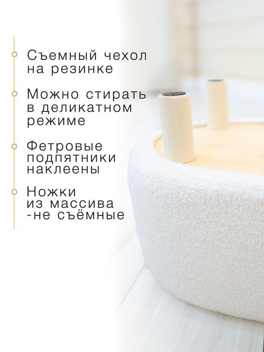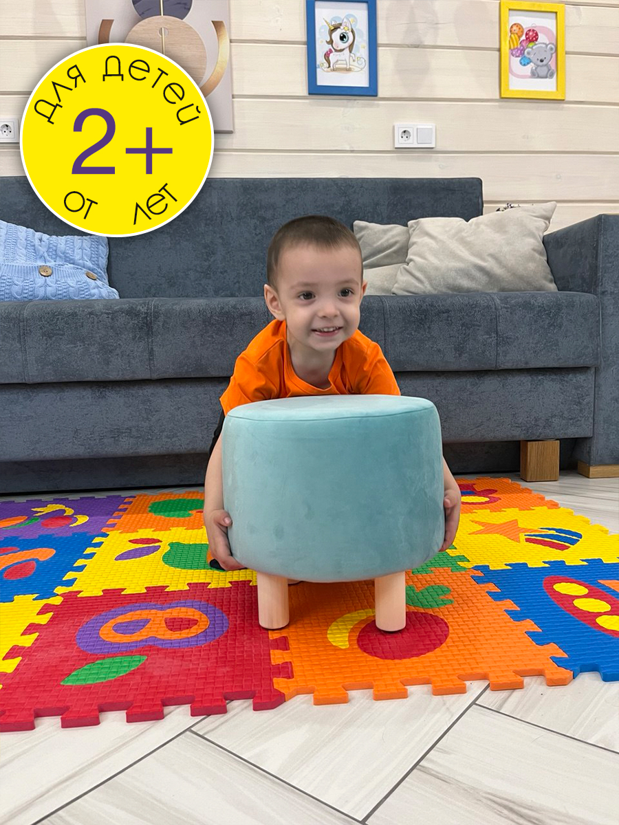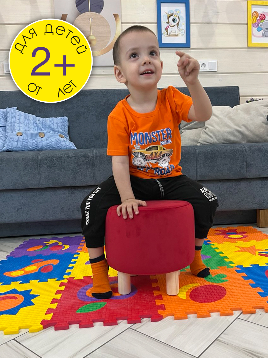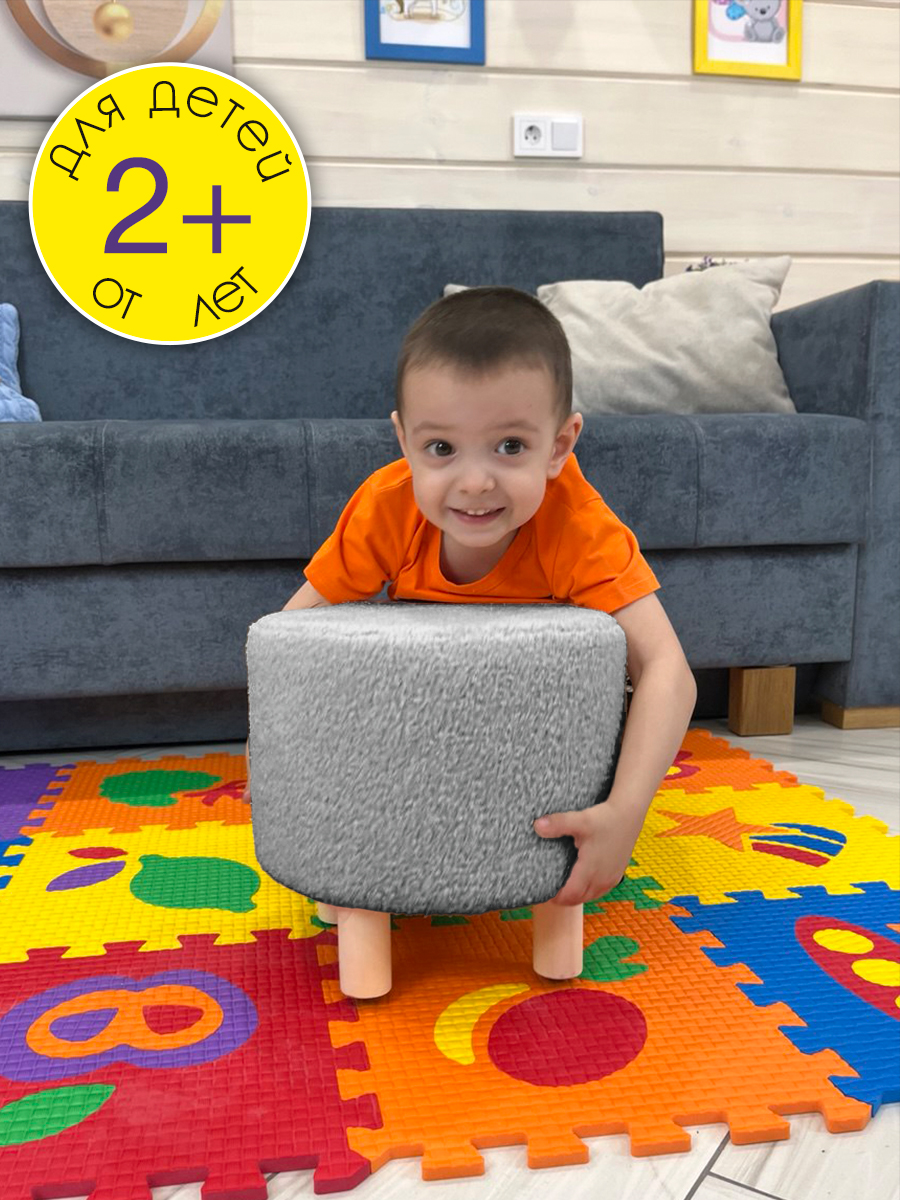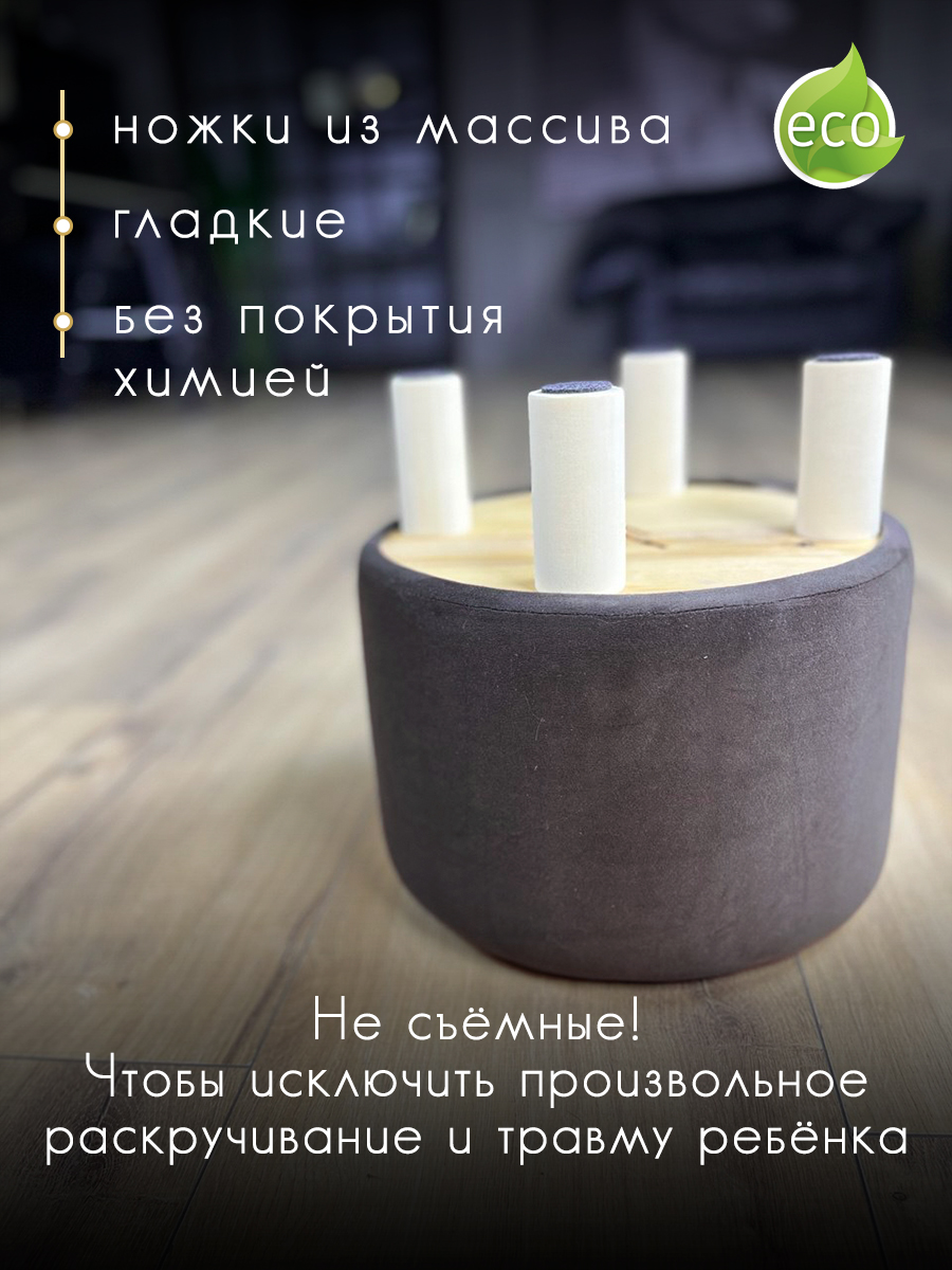 Детский пуф очень лёгкий, вес всего 1,5 кг. Двухлетний малыш без труда поднимает и несёт его по комнате. Каркас пуфа изготовлен из фанеры, поэтому наш маленький стульчик не только легкий и крепкий, но и экологичный, что особенно важно в детской мебели. Высота банкетки 27 см, диаметр 28 см, высота ножек 8 см. Ножки изготовлены из натурального дерева, гладкие и ровные, фетровые подпятники для защиты вашего пола уже установлены. Для наибольшей безопасности ребёнка ножки не снимаются, они основательно крепятся ещё в каркасе, поэтому произвольное раскручивание и поломка исключены на 100%. Верхнее покрытие пуфа поролоновое, толщиной 2 см, боковой поролон толщиной в 1 см. Резинка-фиксатор уже вшита и отрегулирована на нужное натяжение.
