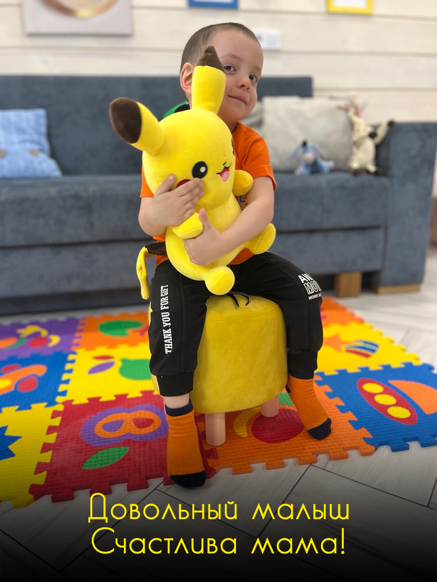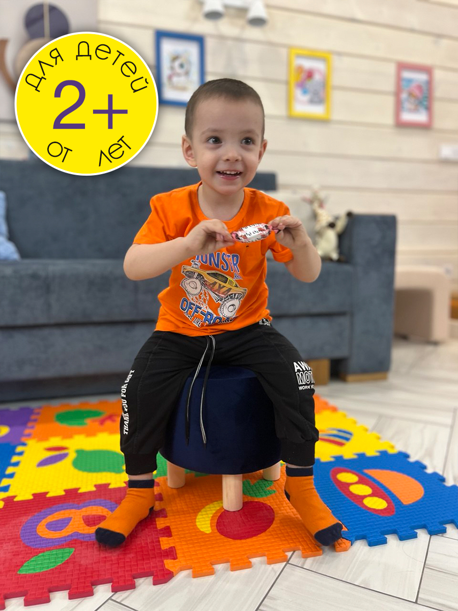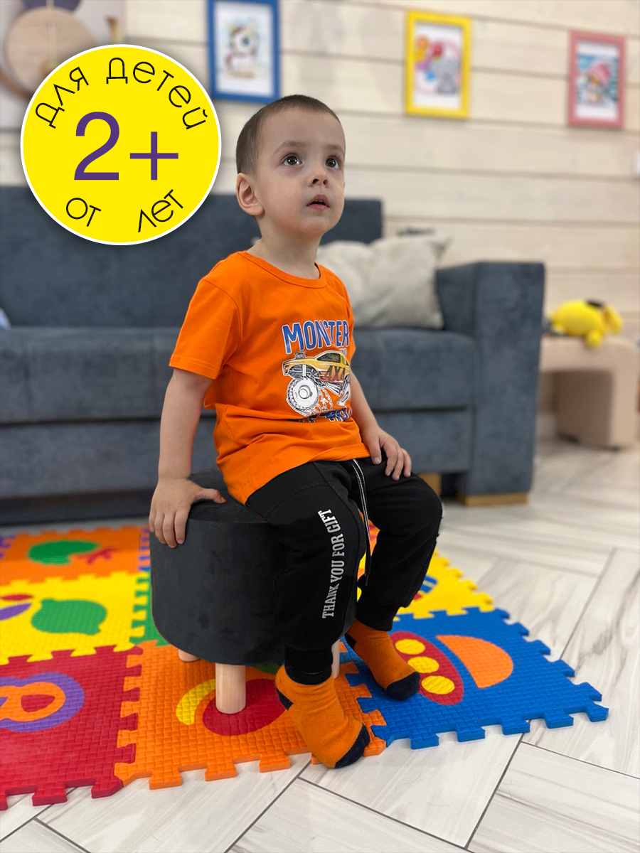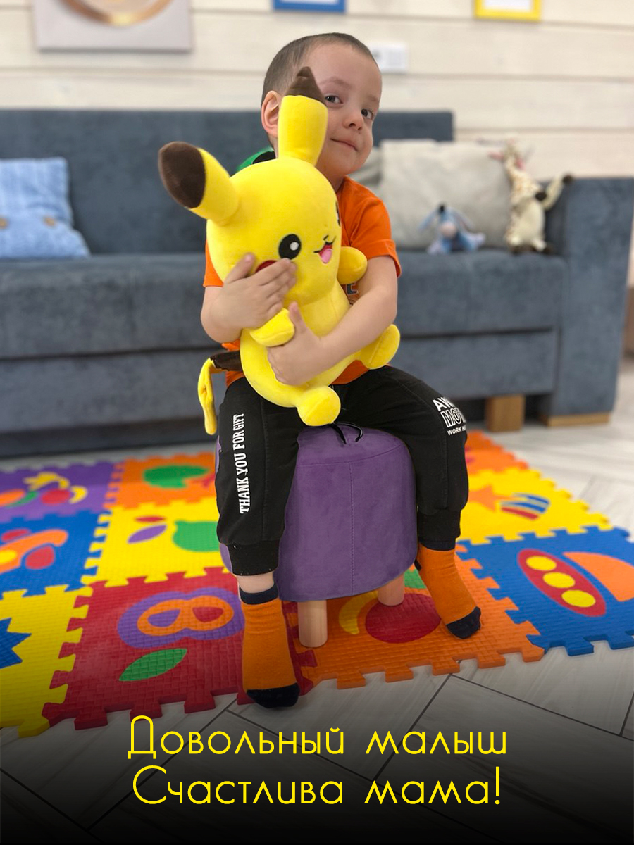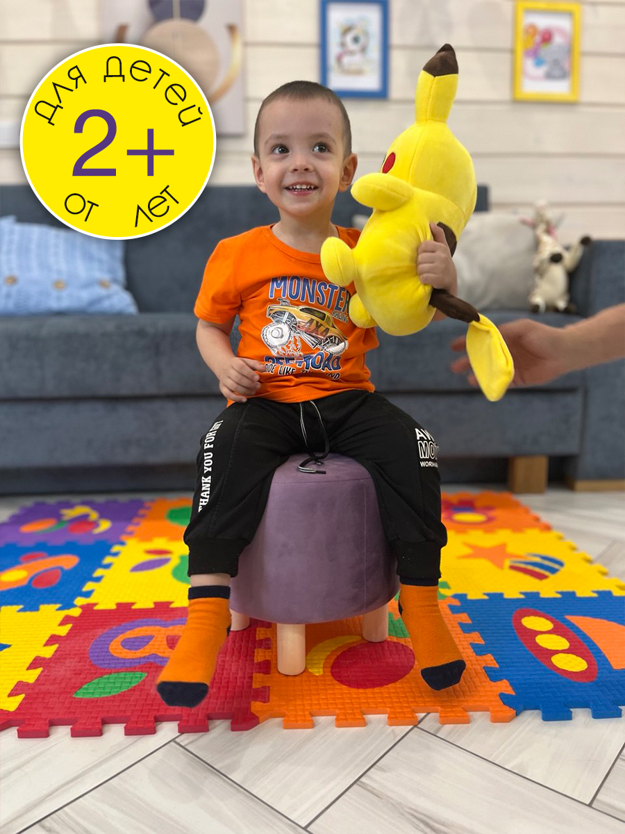 Детский пуф очень лёгкий, вес всего 1,5 кг. Двухлетний малыш без труда поднимает и несёт его по комнате. Каркас пуфа изготовлен из фанеры, поэтому наш маленький стульчик не только легкий и крепкий, но и экологичный, что особенно важно в детской мебели. Высота банкетки 27 см, диаметр 28 см, высота ножек 8 см. Ножки изготовлены из натурального дерева, гладкие и ровные, фетровые подпятники для защиты вашего пола уже установлены. Для наибольшей безопасности ребёнка ножки не снимаются, они основательно крепятся ещё в каркасе, поэтому произвольное раскручивание и поломка исключены на 100%. Верхнее покрытие пуфа поролоновое, толщиной 2 см, боковой поролон толщиной в 1 см. Резинка-фиксатор уже вшита и отрегулирована на нужное натяжение.