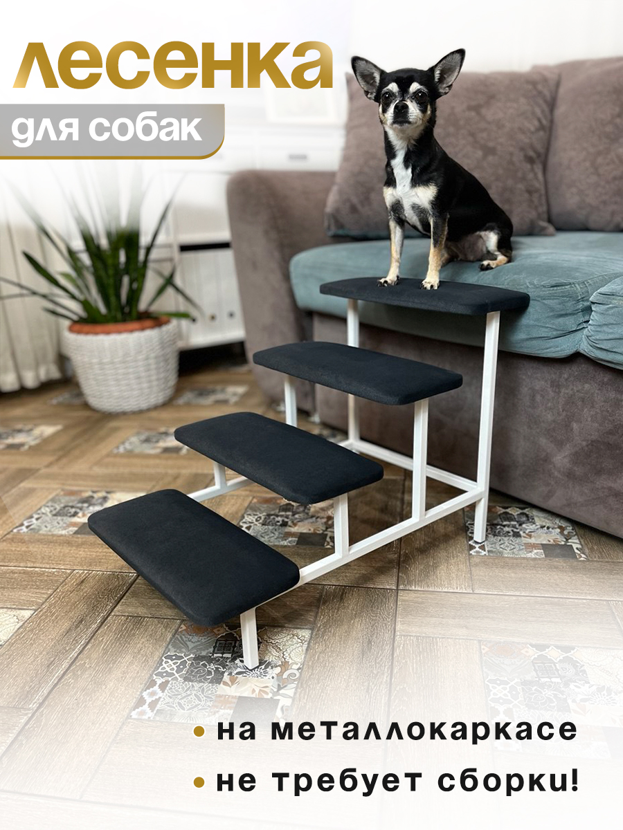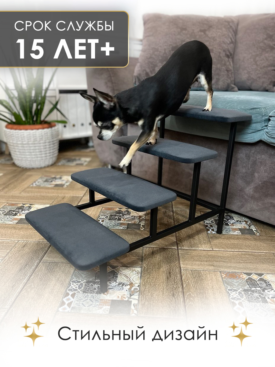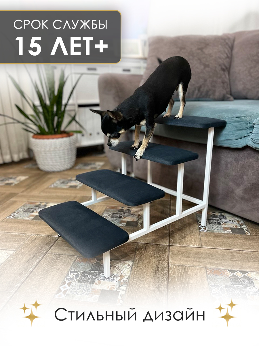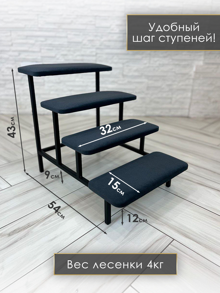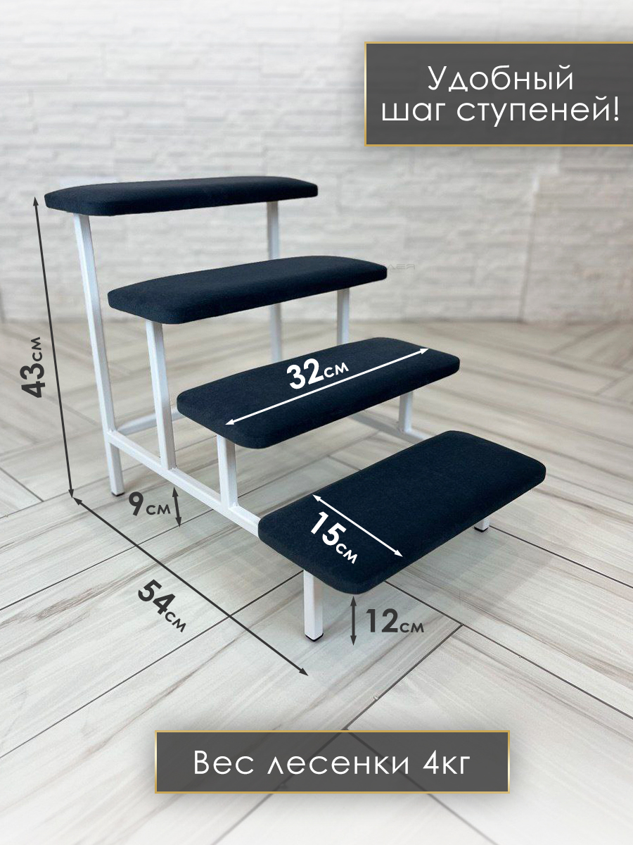 Лестница для собачек маленьких пород прикроватная на металлокаркасе в стиле Лофт! Совершенно новое дизайнерское изделие домашней мебели, аналогов которому на сегодняшний день на рынке нет. Благодаря своему эстетичному внешнему виду лесенка гармонично впишется в любой современный интерьер , поэтому мы предлагаем вам несколько вариантов расцветок и материала, как на белом каркасе, так и на чёрном. Лёгкая по весу, но в то же время прочная конструкция собрана из металлического профили 15 мм с использованием сварки, полностью ручная работа. Металл покрыт порошково-полимерной краской с повышенной износостойкость, максимальная допустимая нагрузка до 40 кг. Панели выполнены из фанеры 12 мм, с закруглениями на углах; мягкие, покрыты поролоном в 1 см. Крепятся панели к каркасу лесенки для животных на цинковые саморезы с увеличенной шляпкой. Обратите внимание-для собак предпочтительнее более глубокий шаг ступени, поэтому верхняя и нижняя ступень установлены со смещением, для наибольшего удобства вашего питомца при спуске и подъёме. Вы можете изменить расположение ступенек на своё усмотрение. Лестница для собачек имеет универсальную высоту 43 см оптимально подойдёт для кровати, дивана, кресла, банкеток и скамеек. Вы можете смело двигать её по поверхности пола, установленные пластиковые заглушки-подпятники следов не оставят. Доставляется прикроватная лесенка для собак в собранном виде, в крепкой картонной коробке, и весит при этом всего 5 кг.