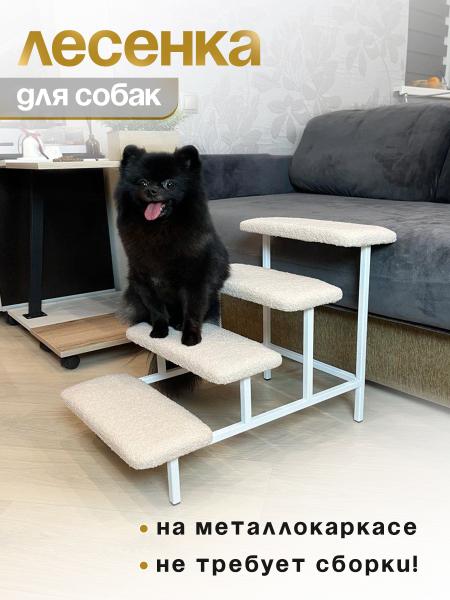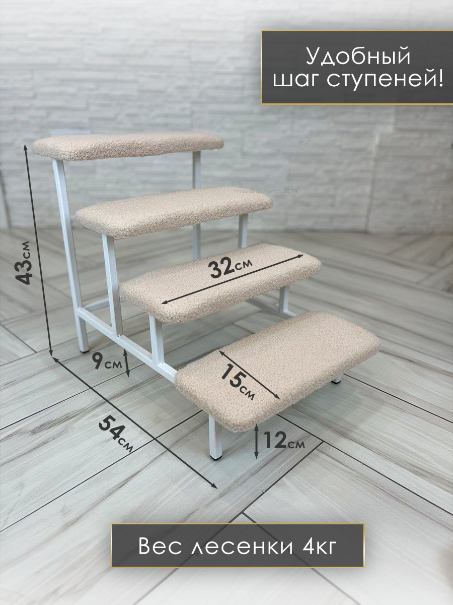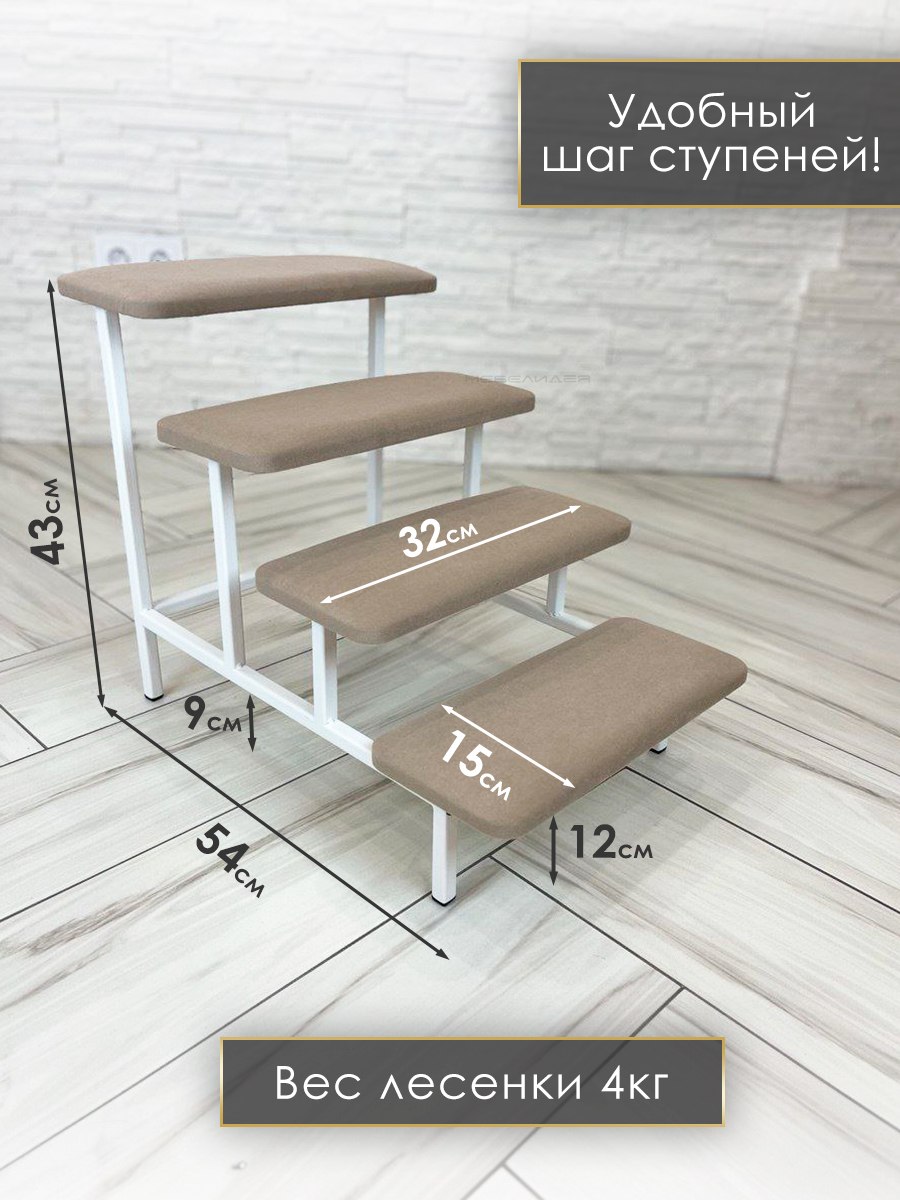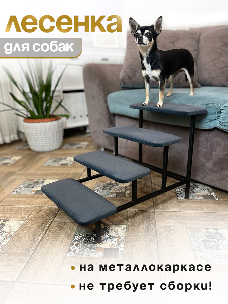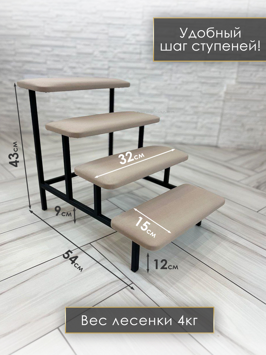 Лестница для собачек маленьких пород прикроватная на металлокаркасе в стиле Лофт! Совершенно новое дизайнерское изделие домашней мебели, аналогов которому на сегодняшний день на рынке нет. Благодаря своему эстетичному внешнему виду лесенка гармонично впишется в любой современный интерьер , поэтому мы предлагаем вам несколько вариантов расцветок и материала, как на белом каркасе, так и на чёрном. Лёгкая по весу, но в то же время прочная конструкция собрана из металлического профили 15 мм с использованием сварки, полностью ручная работа. Металл покрыт порошково-полимерной краской с повышенной износостойкость, максимальная допустимая нагрузка до 40 кг. Панели выполнены из фанеры 12 мм, с закруглениями на углах; мягкие, покрыты поролоном в 1 см. Крепятся панели к каркасу лесенки для животных на цинковые саморезы с увеличенной шляпкой. Обратите внимание-для собак предпочтительнее более глубокий шаг ступени, поэтому верхняя и нижняя ступень установлены со смещением, для наибольшего удобства вашего питомца при спуске и подъёме. Вы можете изменить расположение ступенек на своё усмотрение. Лестница для собачек имеет универсальную высоту 43 см оптимально подойдёт для кровати, дивана, кресла, банкеток и скамеек. Вы можете смело двигать её по поверхности пола, установленные пластиковые заглушки-подпятники следов не оставят. Доставляется прикроватная лесенка для собак в собранном виде, в крепкой картонной коробке, и весит при этом всего 5 кг.