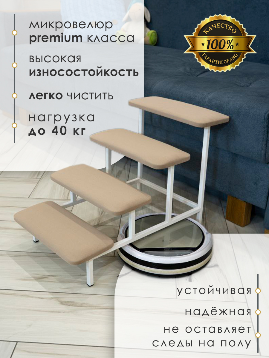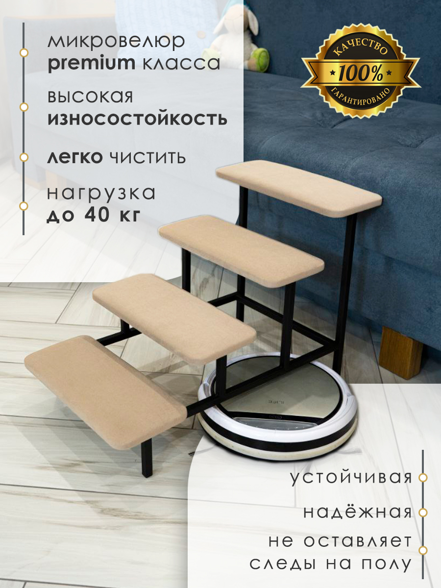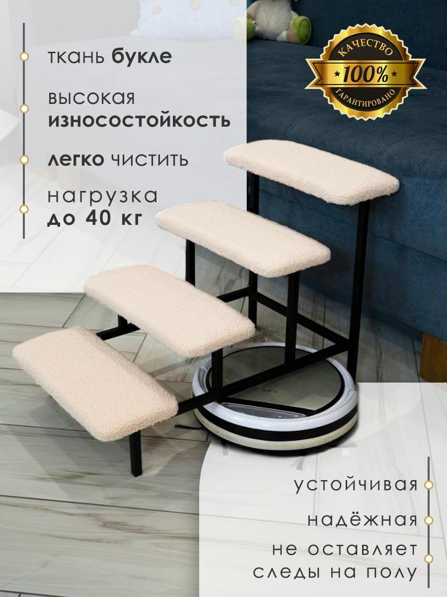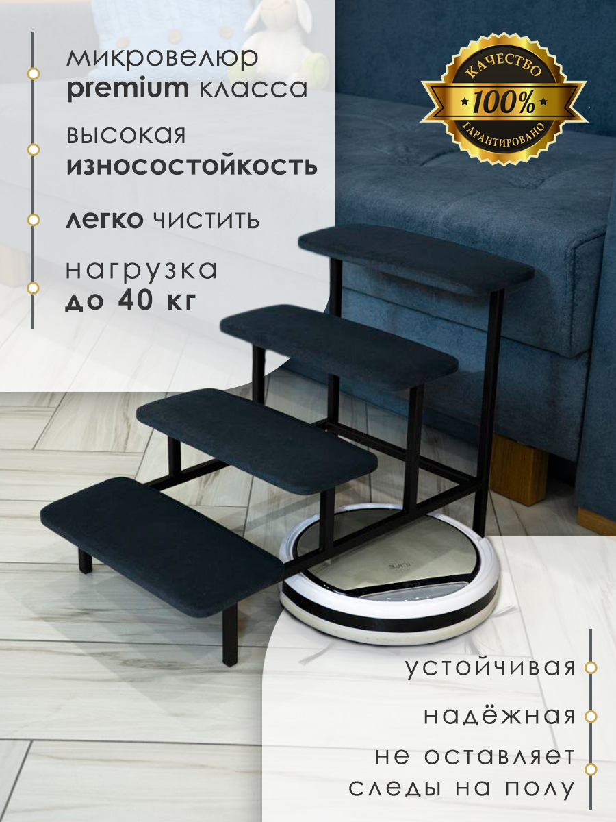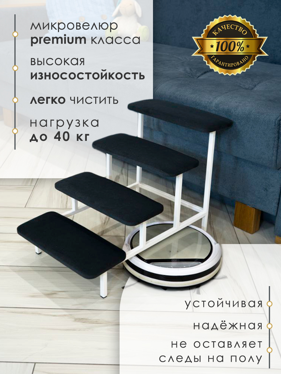 Лестница для собачек маленьких пород прикроватная на металлокаркасе в стиле Лофт! Совершенно новое дизайнерское изделие домашней мебели, аналогов которому на сегодняшний день на рынке нет. Благодаря своему эстетичному внешнему виду лесенка гармонично впишется в любой современный интерьер , поэтому мы предлагаем вам несколько вариантов расцветок и материала, как на белом каркасе, так и на чёрном. Лёгкая по весу, но в то же время прочная конструкция собрана из металлического профили 15 мм с использованием сварки, полностью ручная работа. Металл покрыт порошково-полимерной краской с повышенной износостойкость, максимальная допустимая нагрузка до 40 кг. Панели выполнены из фанеры 12 мм, с закруглениями на углах; мягкие, покрыты поролоном в 1 см. Крепятся панели к каркасу лесенки для животных на цинковые саморезы с увеличенной шляпкой. Обратите внимание-для собак предпочтительнее более глубокий шаг ступени, поэтому верхняя и нижняя ступень установлены со смещением, для наибольшего удобства вашего питомца при спуске и подъёме. Вы можете изменить расположение ступенек на своё усмотрение. Лестница для собачек имеет универсальную высоту 43 см оптимально подойдёт для кровати, дивана, кресла, банкеток и скамеек. Вы можете смело двигать её по поверхности пола, установленные пластиковые заглушки-подпятники следов не оставят. Доставляется прикроватная лесенка для собак в собранном виде, в крепкой картонной коробке, и весит при этом всего 5 кг.