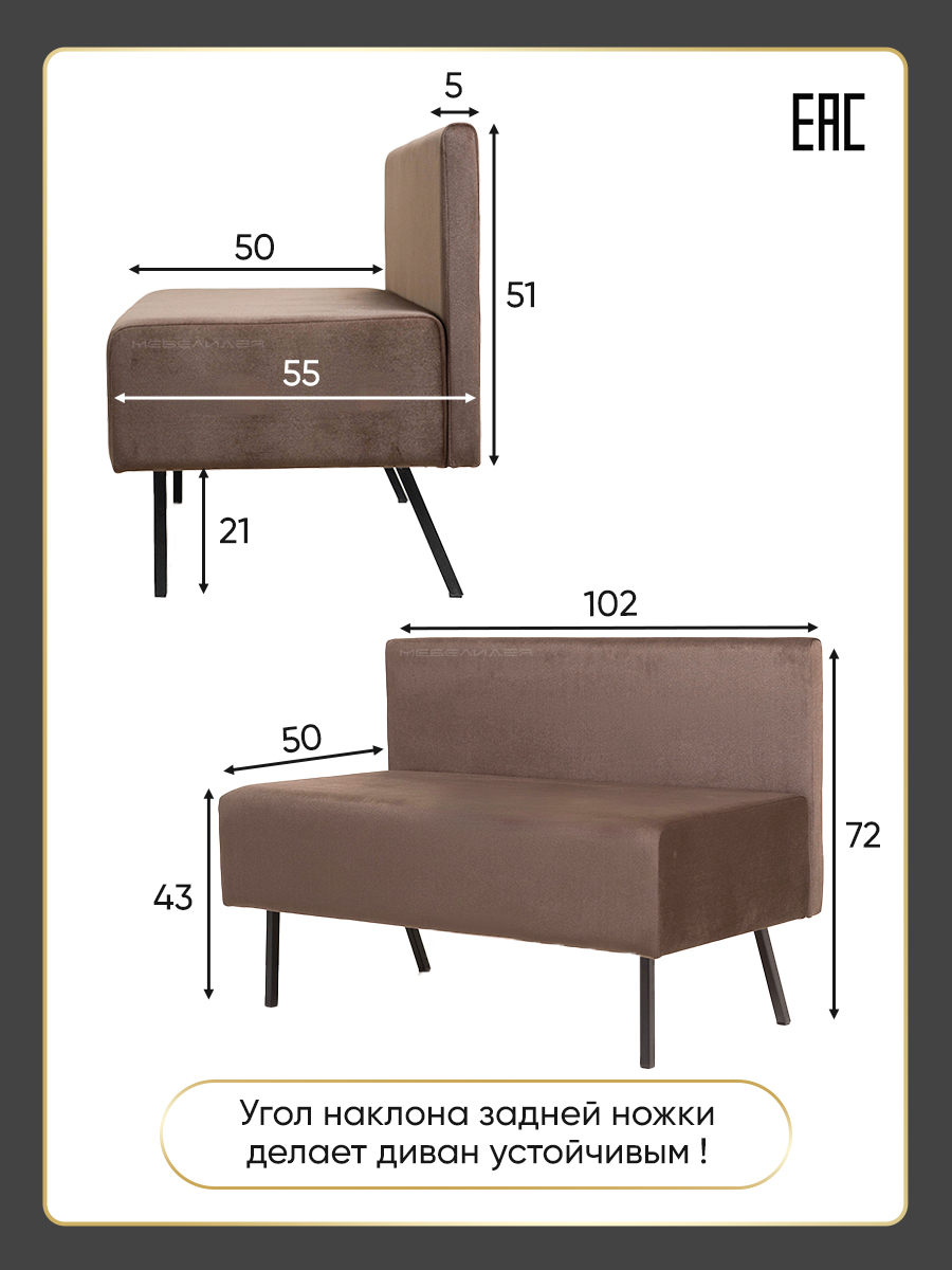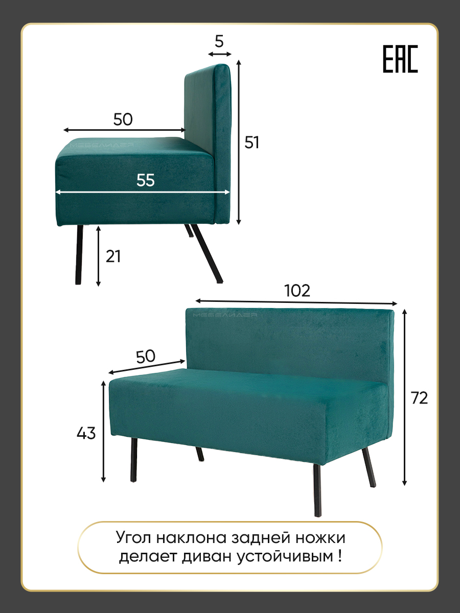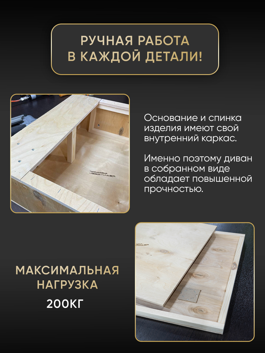 Мы разработали особый вид каркаса диванов, и технологию их изготовления.Используем берёзовую фанеру и сухой сосновый брус-это экологичные материалы, крепкие, легкие и устойчивые к большим нагрузкам. И основание, и спинка имеет свой внутренний каркас,что позволяет дивану в собранном виде выдерживать нагрузку в 200 кг. Ножки в дизайнерском диване изготовлены из металлического профиля, 20×20 мм. К площадкам крепятся с использованием сварки, сами же площадки металлические, толщиной 3 мм, вырезаются на лазерном ЧПУ станке. Покрываются ножки порошково-полимерной краской черного цвета, устойчивой к механическим повреждениям. В сборе диван имеет прямой угол, вплотную придвигается спинкой к основанию стены и даже при наличии плинтуса задние ножки его не задевают. Пластиковые заглушки уже установлены , что позволяет свободно передвигать изделие по полу без повреждений поверхности. Угол ножек в 25 градусов делает мини диванчик особенно устойчивым и внешне выразительным в любом интерьере. Для сборки вам потребуется только крестовая отвёртка, и несколько минут вашего времени; подробная инструкция в комплекте. Весь монтаж нашего дивана производится на винты, которые предварительно проходят проверку на качество резьбы, чтобы исключить заводской брак. Наша компания не пытается конкурировать с более бюджетными аналогами: ткани премиального класса, материалы качественные, технология более трудоёмкая и затратная, все это повышает себестоимость изделия. Но в конечном итоге мы получаем надёжный и красивый товар, готовый на многолетнюю службу для своих владельцев. Вес диванчика без упаковки-18 кг. Желаем вам хороших покупок!