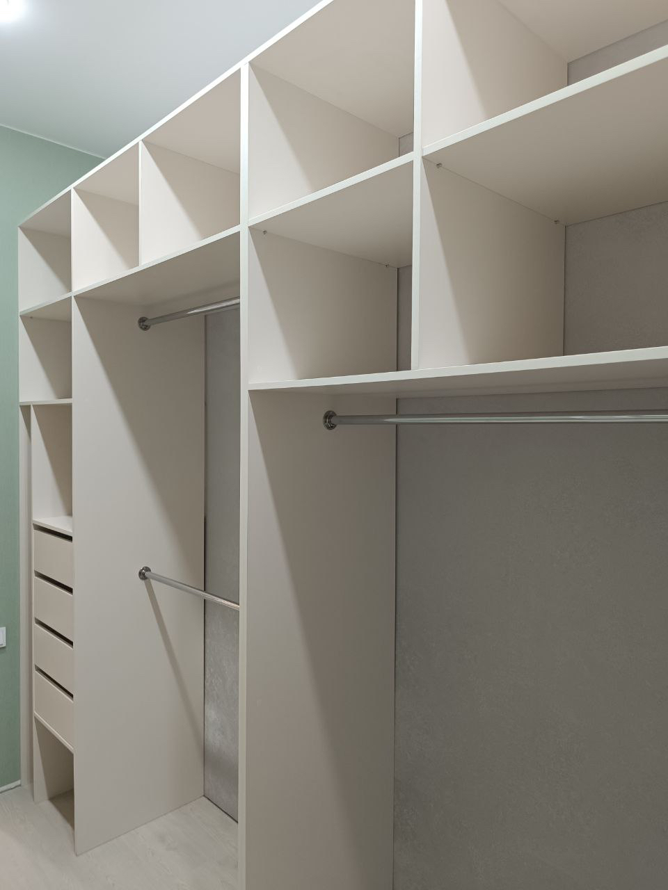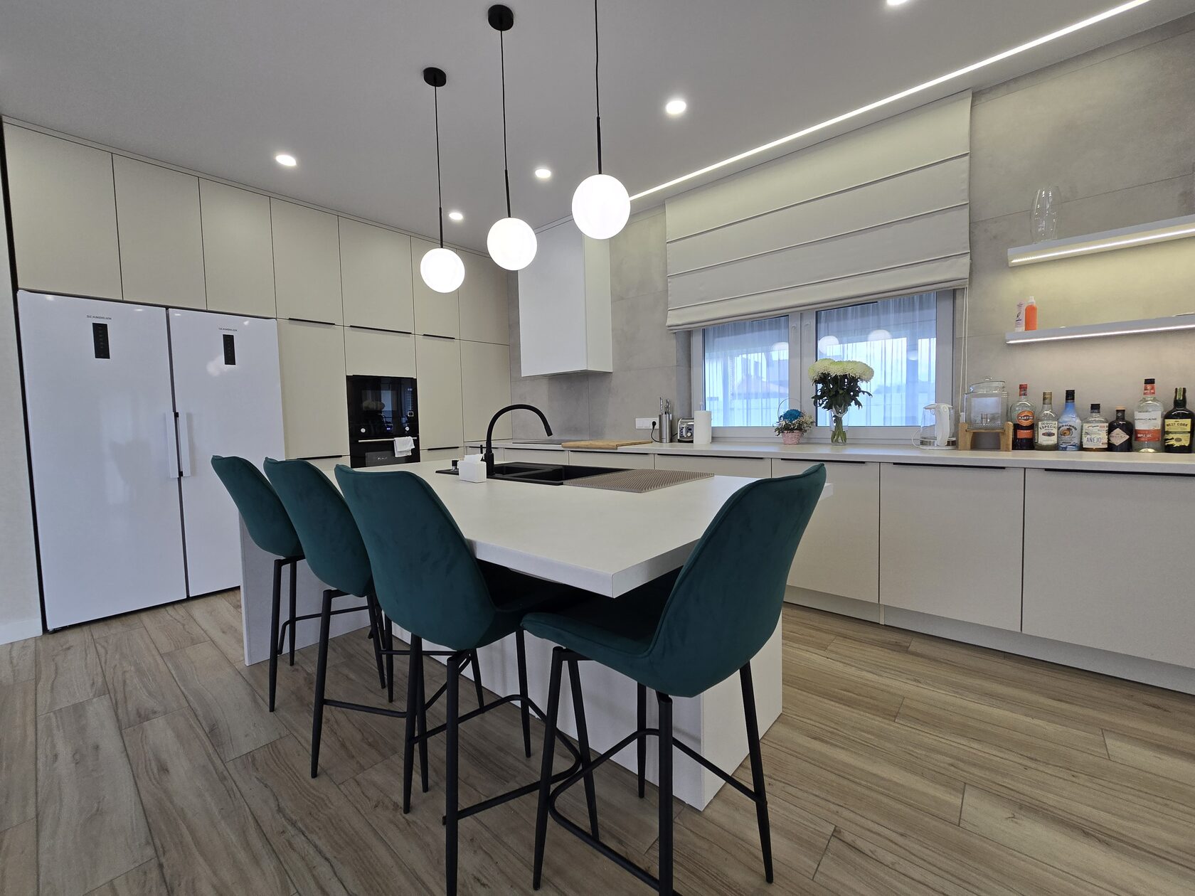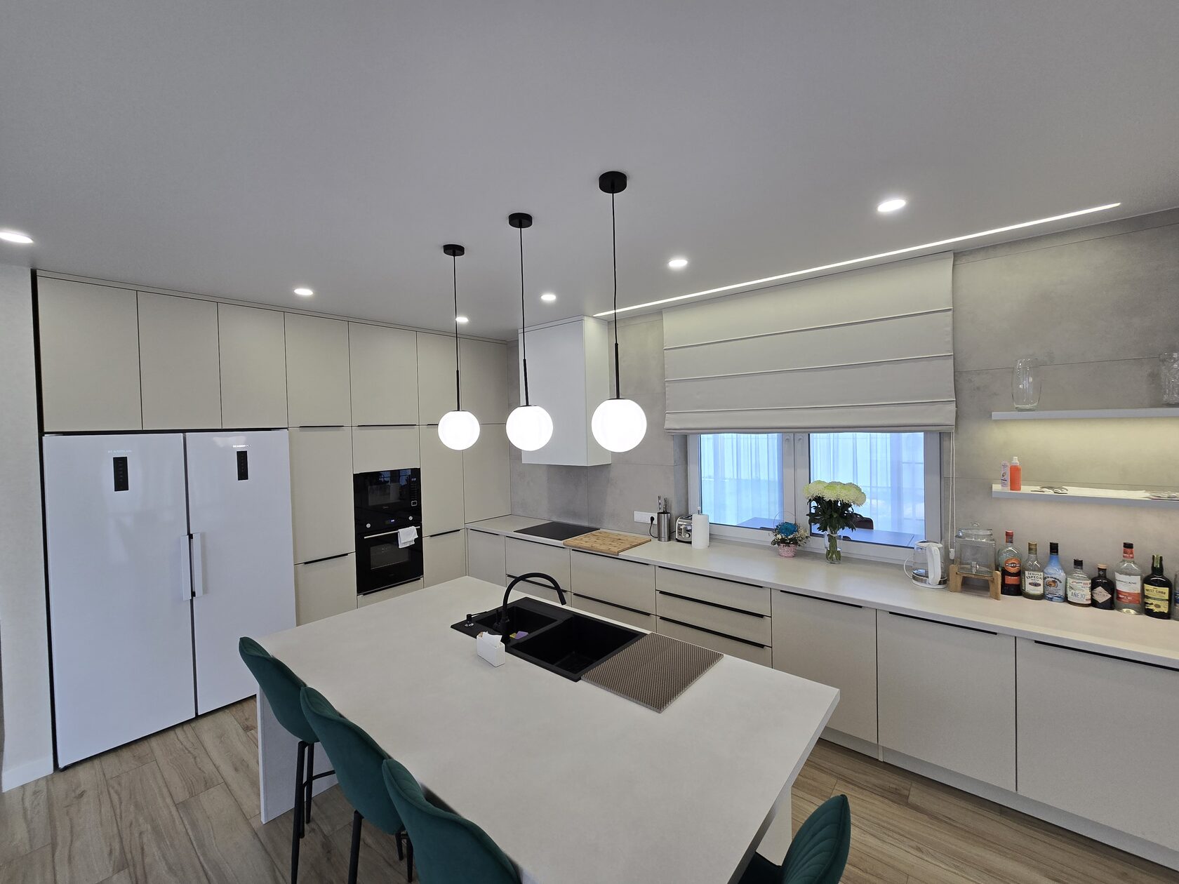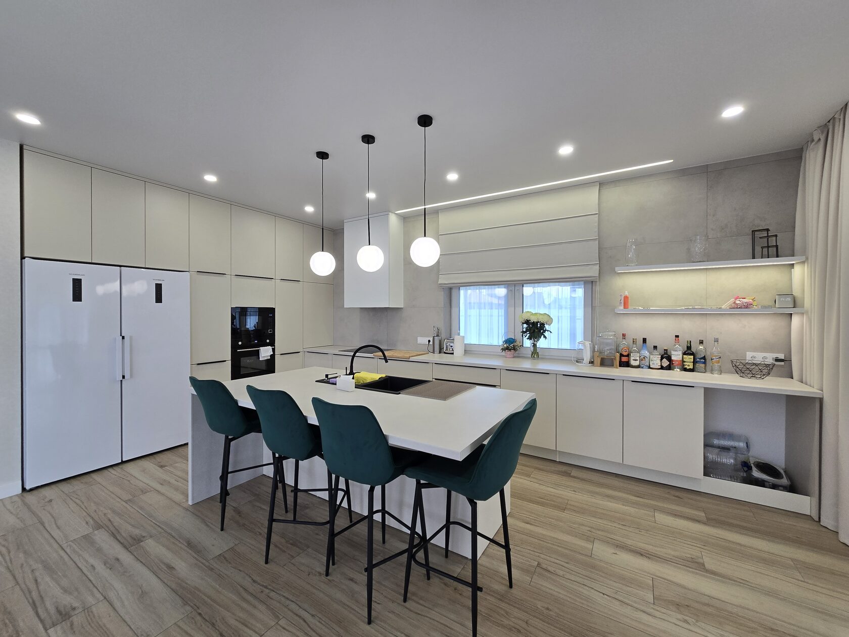 П-образная кухня, фасады-глянцевый пластик. Барная стойка с металлическим каркасом в основании. Шкаф для прихожей и гардеробная из ЛДСП, в цвет кухни. г. Нерехта